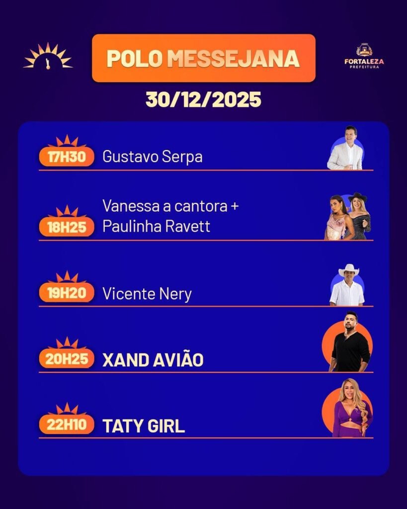 No Polo Messejana (30/12), a festa começa com o cantor Gustavo Serpa, seguido por Vanessa A Cantora com Paulinha Ravett e o artista Vicente Nery. Na reta final da noite, o comandante Xand Avião envolve o público, e o encerramento fica por conta de Taty Girl.