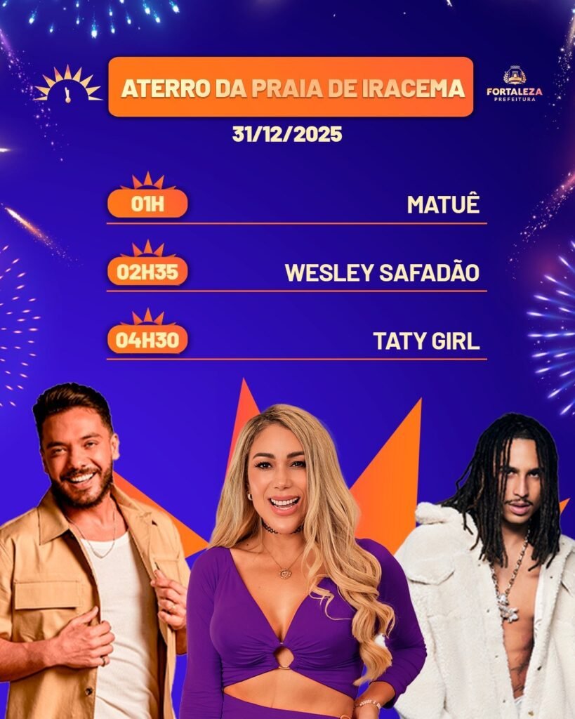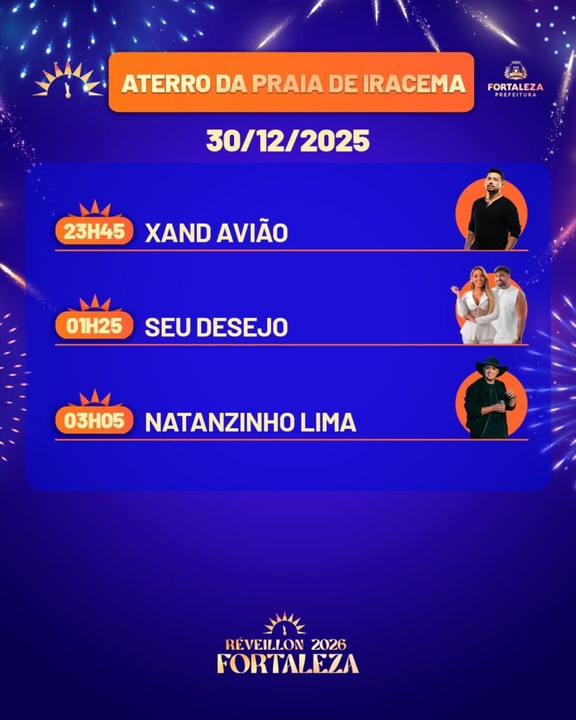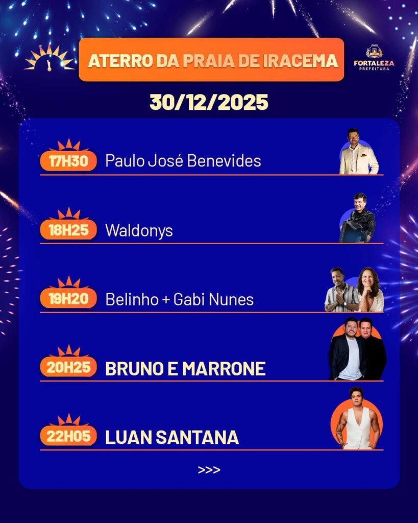 A programação no Aterro da Praia de Iracema no dia (30/12) terá início com Paulo José Benevides, seguido por Waldonys, Belinho da Silva, Gabi Nunes e a dupla Bruno e Marrone. Na sequência, o palco recebe Luan Santana e Xand Avião. Já na madrugada, o público acompanha o show romântico da banda Seu Desejo, com encerramento ao som do brega-piseiro com Natanzinho Lima.
