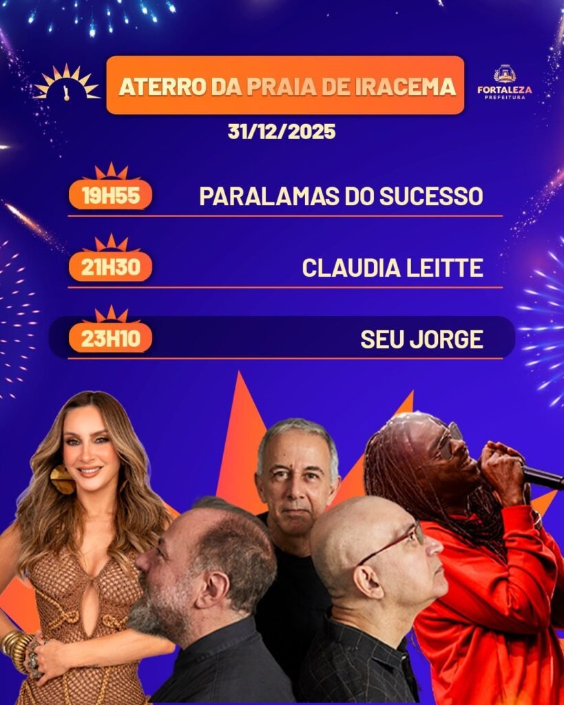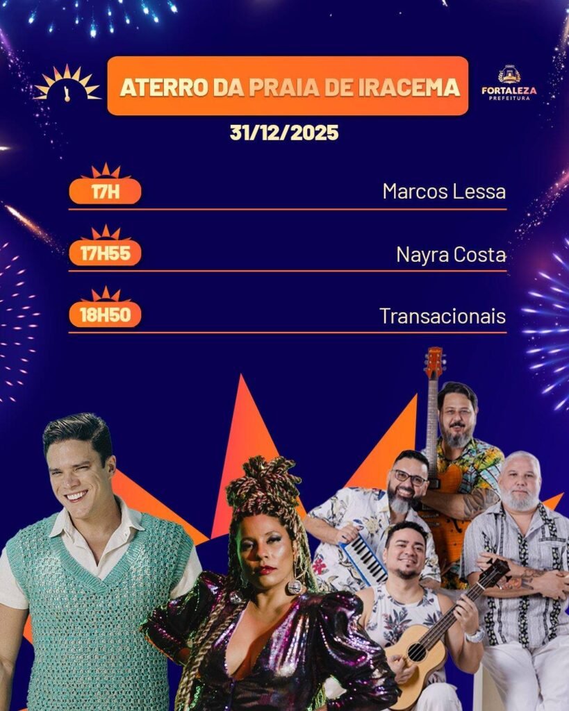 Na noite da virada, dia 31 de dezembro, o Aterro da Praia de Iracema recebe Marcos Lessa, Nayra Costa e Transacionais, abrindo a programação. Em seguida, o público acompanha o som da banda Paralamas do Sucesso e curte com a cantora Claudia Leitte. O momento da virada será conduzido por Seu Jorge, que retorna ao palco após o espetáculo de fogos. Na sequência, o trapper Matuê assume o palco, seguido pelo forró autêntico de Wesley Safadão, com encerramento da programação ao som da cantora Taty Girl até o amanhecer do primeiro dia do novo ano.
