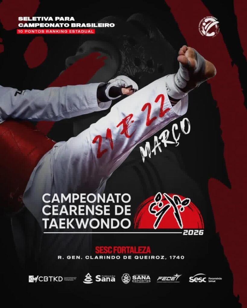 O Campeonato Cearense de Taekwondo 2026 será realizado nos dias 21 e 22 de março, no Sesc Fortaleza, marcando a 1ª etapa do Circuito Cearense da modalidade. A competição é promovida pela Federação Cearense Esportiva de Taekwondo (FECET), em parceria com a Fundação Sana. A cerimônia de abertura será às 11h, com a presença do campeão mundial da modalidade, Henrique Marques.
